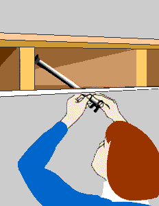 Cut a hole in the ceiling about 5 inches in diameter (see Installing Boxes in Finished Space, Related Projects, for tips on locating it). Most brace bars have a screwlike fastener at each end that fixes the bar in place. Tip the bar through the hole, then center it over the hole, perpendicular to the joists.