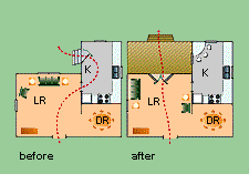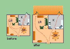 In this example, moving the back door redirected traffic and significantly improved the kitchen space. A double window in the family room was replaced with a patio door so traffic to the deck and yard was routed away from the kitchen. Replacing the door in the kitchen with a window allowed room for a bright eating area, or the space could have been used for cabinet and counter storage. If the kitchen is large enough, you also could keep the existing door in place.