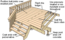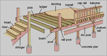 At first glance, a deck looks like a simple tablelike structure. In fact, decks are comprised of layers of construction, each with its own name and specific function. By taking the time to learn the anatomy of a deck, you will be well on your way to understanding the steps required to construct one. The illustration above and the following text identify all of the important components of a typical deck. Specific types of decks may differ a bit; such variations are discussed in related topics.