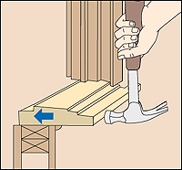 Remove the old saddle or sill. This probably will be the most difficult part of the job. Use a chisel or old screwdriver to probe for nails that may be holding the piece in place. If you can't get the nails out, in the end you simply may have to saw out a section, as shown below, or demolish it by splitting it along the grain with a hammer and chisel, then pulling out the splintered remains.