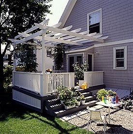 Bigger isn't always better. Case in point: The small backyard of this house would be overwhelmed by an expansive deck. A well-proportioned deck graced with an arbor and a fence provide an elegant, private outdoor room. The grey and white paint scheme neatly complements the home's color.