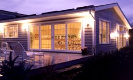 As knowledgeable designers know, you can only experience something through being exposed to its opposite. The bank of doors on this ranch house is a beautiful feature. Why fight them? A simple platform-like deck complements the doors and lends the illusion of spaciousness to a small house. As you think about your design, consider contrasts like this as well as the similarities.