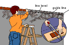 Start at the top of the wall to ensure there will be a full course of brick where appearance counts. Attach a string running the length of the wall, held out from the wall about 1/2 inch, exactly one course down from the ceiling. Use a line level to make sure the string is level. If your ceiling is wavy or out of level, you may need to bring the line down a bit to make room for every brick. Press each brick into the adhesive, twisting it slightly to ensure a good bond. Align the bricks to the string. Leave 3/8 inch between bricks for normal-looking joints. To cut the bricks, use a hacksaw with a masonry cutting blade or rod.