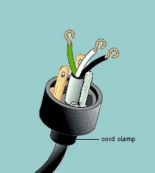 Some plugs have a clamp that grips the cord where it enters the base. For these plugs, it is not necessary to tie an underwriters knot. Simply slide the plug onto the cord and strip about 1/2 inch of insulation from the ends of the three wires. Twist the strands tight, and use needle-nose pliers to form hooks. |