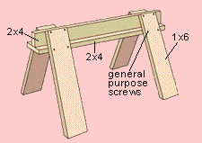 You'll need a stable work platform on which to cut your deck material. This sawhorse design is easy to build and far more sturdy than the metal-bracket and scrap-lumber types you can buy at home centers. Cut one 8-foot 2x4 in half to make the T-beam. Make the 30-inch legs from a single 10-foot 1x6. Put it together with 21/2-inch general-purpose screws.