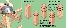 Don't settle for a flat post top. Take a few minutes to decorate the post using a circular saw or tablesaw. Cut identical bevels on each side of the post to create a pointed cap. Not only is this more attractive, it also sheds water and adds longevity to the post. You also can cut grooves around the posts. Sketch out the design you want, then mark cut lines on each post. Using a circular saw or tablesaw, make a single pass for a thin groove or multiple passes for a wider groove. Or use a router with any one of several router bits to make decorative grooves. Getting grooves to line up around the post is tricky. Practice first on some scrap material.
