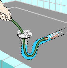 If all else fails, try forcing out the blockage with a hose. Stick it in as far as it will easily go, and pack rags tightly around the hose at the drain opening. Hold everything in place, and have a helper turn the water fully on and off a few times.