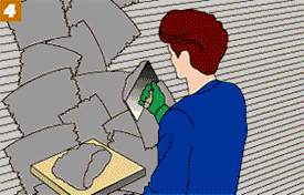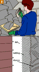 To stipple the top coat, hold a whisk broom at an angle to the wall and pat the surface with the ends of the bristles in an irregular pattern. For a travertine finish, spatter on a coat of thin mortar in a contrasting color and trowel it slightly after it has stiffened. To make an imprint, use leaves or other patterns to make imprints in the soft mortar and trowel the surface lightly.