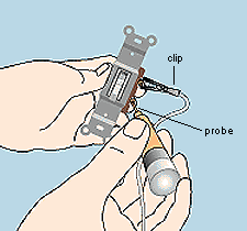 To check out a three-way switch, shut off the circuit and attach the clip to the common terminal (it's usually labeled on the switch body). Touch the probe to one of the other screw terminals, and flip the switch. If it's OK, the tester will light when touching one of the two terminals. Flip the switch. The tester should light when the other terminal is touched. |