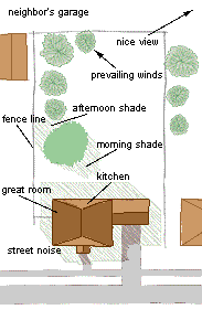 Draw a site plan of your house and yard. Include all doors and windows, as well as utility hookups, walkways, shrubs and trees, and views that you wish to maintain or block out. Note the movement of the sun and how it affects shading and sunlight; be sure to account for seasonal changes. Add every detail that could affect the deck location, such as prevailing winds, buried septic tanks and utility lines, setback requirements, and downspouts. Use tracing paper over the site plan to sketch possible shapes and locations.