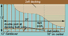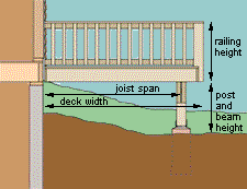 Also called a bird's-eye or overhead view, a plan view shows the footprint of the deck. It is particularly important in establishing exact locations for piers, beams, and joists. An accurately scaled plan view not only helps guide the framing of the deck, it allows you to estimate the amount of lumber to buy. The drawing above combines a view of the finished deck with the decking installed and the foundation and framing. On more complex decks, these two perspectives can be drawn separately. Draw the foundation and framing plan first, then use tracing paper to produce the finished view.
