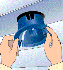 NOTE: Shut off the power. Draw an outline of the new box--a retrofit box with wings for attaching to the eaves will probably work best. Drill starter holes, and cut the hole with a sabersaw or a keyhole saw.