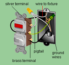 This switch has a bulb that glows when its fixture is on. Connect the black feed wire to the brass terminal on the side that does not have a connecting tab. Pigtail two white wires, and connect them to the silver terminal. Connect the black wire that leads to the fixture to the terminal on the side with the connecting tab.