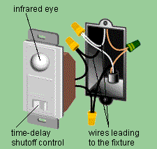 An infrared beam detects movement and turns on a light fixture. A time-delay feature lets you choose how long the light remains on. Connect the neutral wires to each other, not to the switch. Connect the black feed wire to one lead. To the other lead, attach the black wire that runs to the fixture.