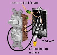 This unit has two switches that fit into a single-switch space. Attach the feed wire to a terminal on the side with the connecting tab. (This tab enables the wire to supply power to both switches.) Connect the two wires that lead to the two fixtures to the terminals on the other side, and connect the white wires together, not to the switch.