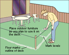 Mark the perimeter of your deck and its various levels with flour. Place your lawn furniture inside the perimeter to get a feel for how much space you need. Use strings to indicate railing heights. Set the string lines at the height of the proposed deck to give you a sense of its profile.